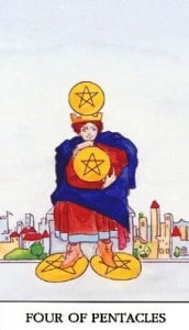 Tarot karta četvorka diskova ili novčića simbolizira financijsku sigurnost, stabilnost te promjene. U poslovnom smislu svaki vaš napor će uroditi plodom i rezultirati će unaprjeđenjem. U financijskom smislu vide se velike promjene na bolje, mogući je veći financijski dobitak. Nemojte strahovati od ulaganja u investicije jer će vam pametno ulaganje donijeti financijsku sigurnost. Čvrste ljubavne veze rezultirati će još boljim odnosom i ozbiljnim planovima za budućnost, dok će osobe koje su u problematičnoj vezi vrlo brzo naći način kako izaći iz takve veze i osjećati se bolje. Četvorka diskova ili novčića upozorava vas da kontrolirajte vaše zdravlje na vrijeme, bilo bi dobro da obavite kompletan sistematski pregled.