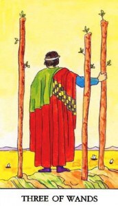 Tarot karta trojka štapova označava da vaši planovi dobro napreduju i da ste spremni za nove prilike koje vam se pružaju kako bi poboljšali svoju budućnost. Tri štapa pokazuju priliku za proširenje novih vidika kroz putovanja, poslovne poduhvate i učenje. Na poslovnom planu trojka štapova prikazuje veliki napredak, samopouzdanje i dobre poslovne odluke. Kartica se često odnosi na putovanja (daleka putovanja preko oceana), dakle potiče vas na ono što ćete otkriti i naučiti na tom putovanju. Ukoliko se prikaže tarot karta trojka štapova znači da vam je zdravstveno stanje izvrsno.